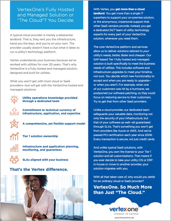 VertexOne understands your business because we've worked with utilities for over 20 years. That's why VertexOne is a fully hosted and managed solution, designed and built for utilities.
