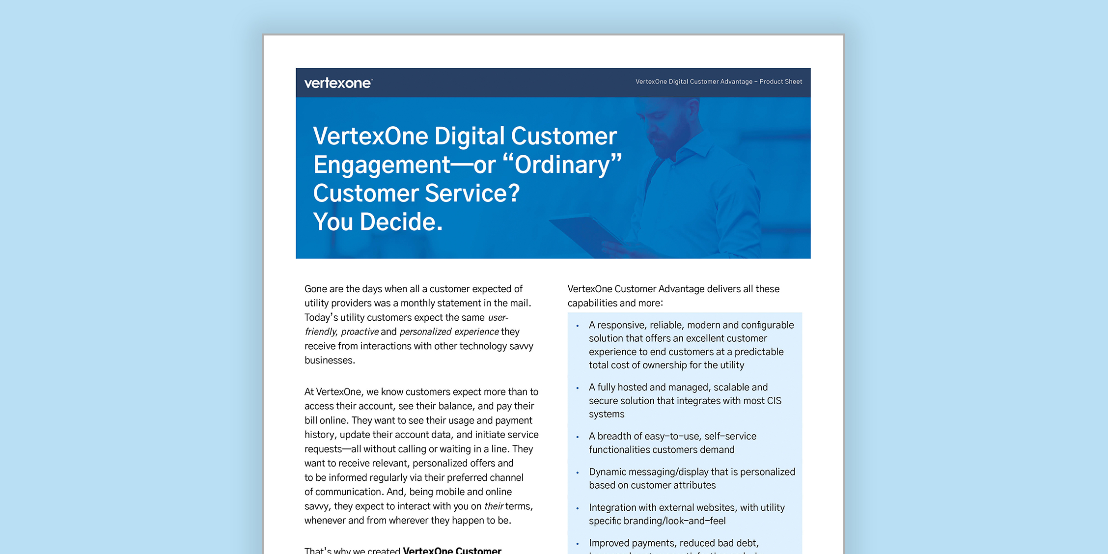 VertexOne is the recognized leader in SaaS platforms for critical business processes of utilities across North America. Through a wide range of innovative services and solutions —including the VertexOne CompleteTM SaaS Solution for Utilities comprised of the Customer Information System (CIS), Mobile Workforce Management (MWM), Meter Data Management (MDM), Digital Customer Engagement and Customer Self Service, and now the addition of WaterSmart solutions and services—VertexOne helps utilities more efficiently deliver a compelling customer experience; reducing the cost to serve customers, increasing operational efficiency, improving customer satisfaction, and driving utility operations forward. VertexOne takes on the heavy lifting of keeping current with the rapid pace of technology changes through our VertexOne CompleteTM SaaS offering, so utilities don’t have to—leaving our customers more time to focus on core utility business while leaving the technology to us.
