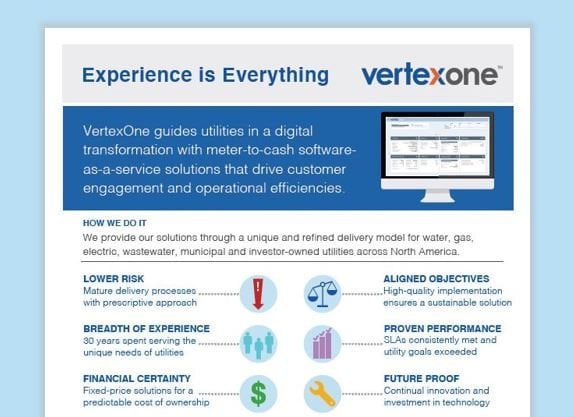 VertexOne is the recognized leader in SaaS platforms for critical business processes of utilities across North America. Through a wide range of innovative services and solutions —including the VertexOne CompleteTM SaaS Solution for Utilities comprised of the Customer Information System (CIS), Mobile Workforce Management (MWM), Meter Data Management (MDM), Digital Customer Engagement and Customer Self Service, and now the addition of WaterSmart solutions and services—VertexOne helps utilities more efficiently deliver a compelling customer experience; reducing the cost to serve customers, increasing operational efficiency, improving customer satisfaction, and driving utility operations forward. VertexOne takes on the heavy lifting of keeping current with the rapid pace of technology changes through our VertexOne CompleteTM SaaS offering, so utilities don’t have to—leaving our customers more time to focus on core utility business while leaving the technology to us.
